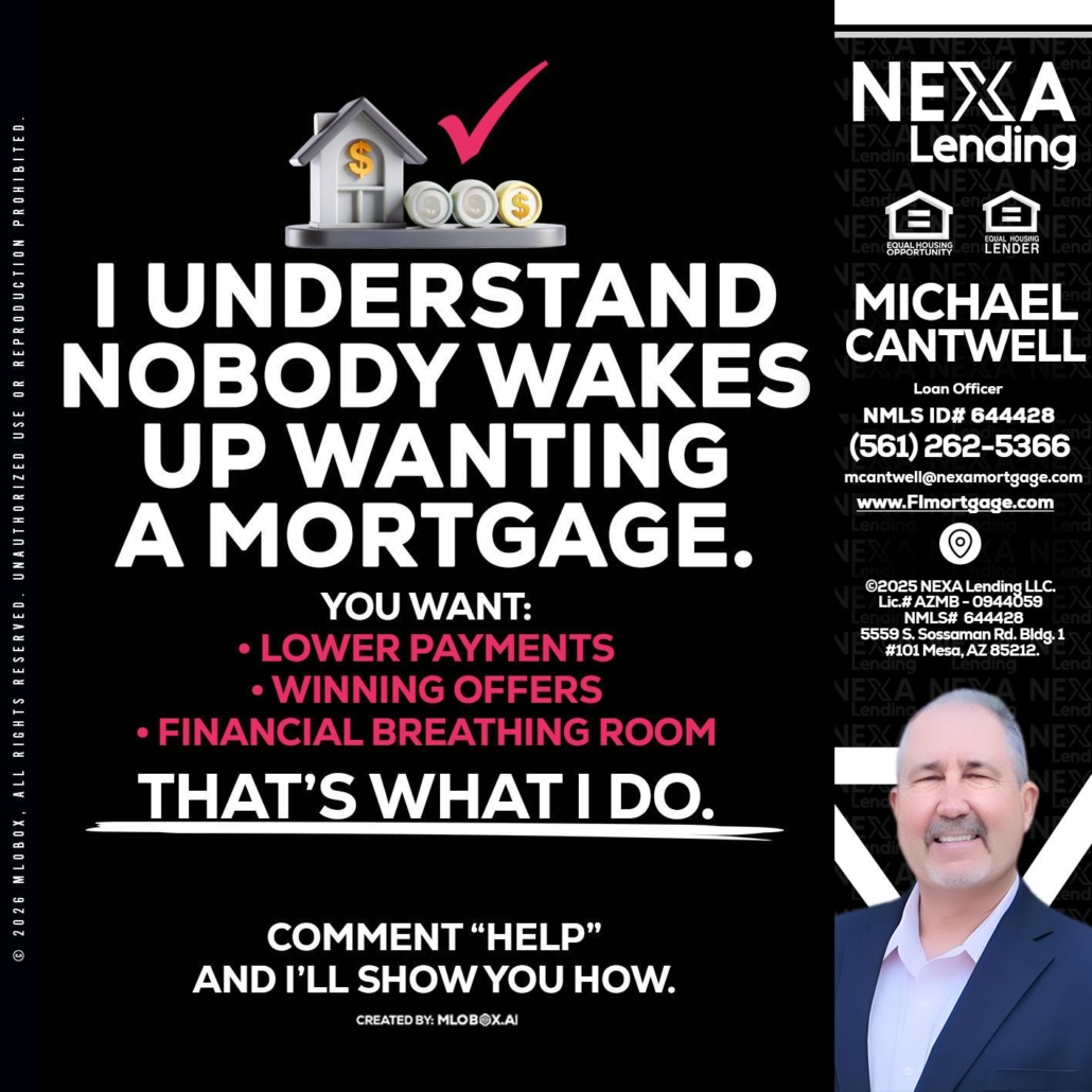 I UNDERSTAND - Michael Cantwell -Loan OfficerHi, my name is Michael Cantwell. I’m a Loan Officer with NEXA Lending LLC., offering personalized mortgage solutions, fast customized quotes, great rates and service with integrity.